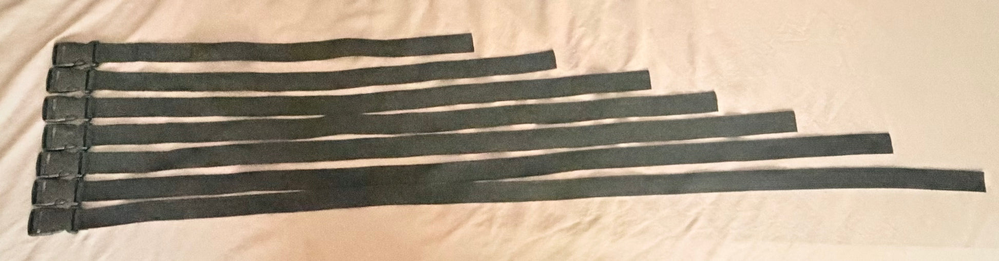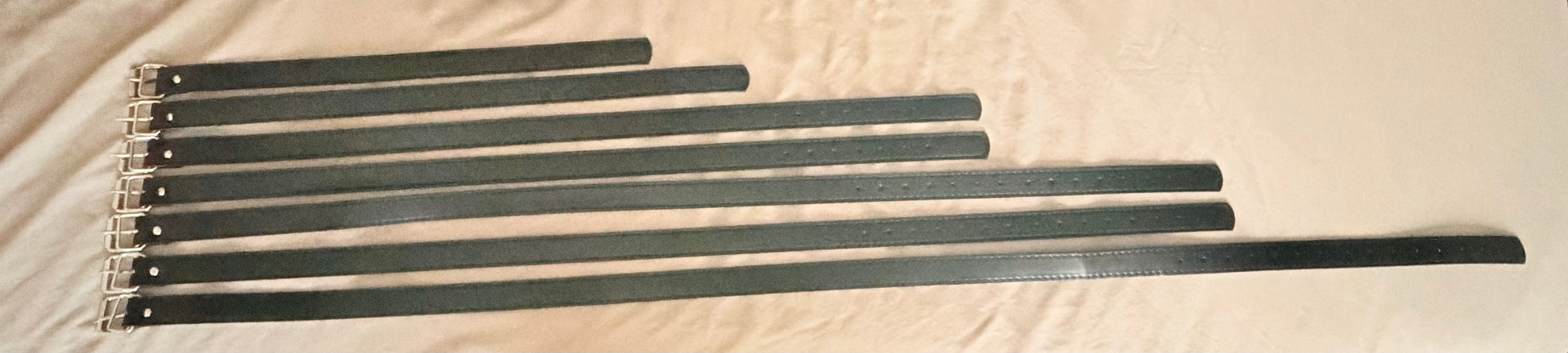 Seven straps of various lengths, use to bind different areas of the body. Two variations: Vegan Leather w/metal buckles and Polyester/nylon webbing w/plastic fasteners