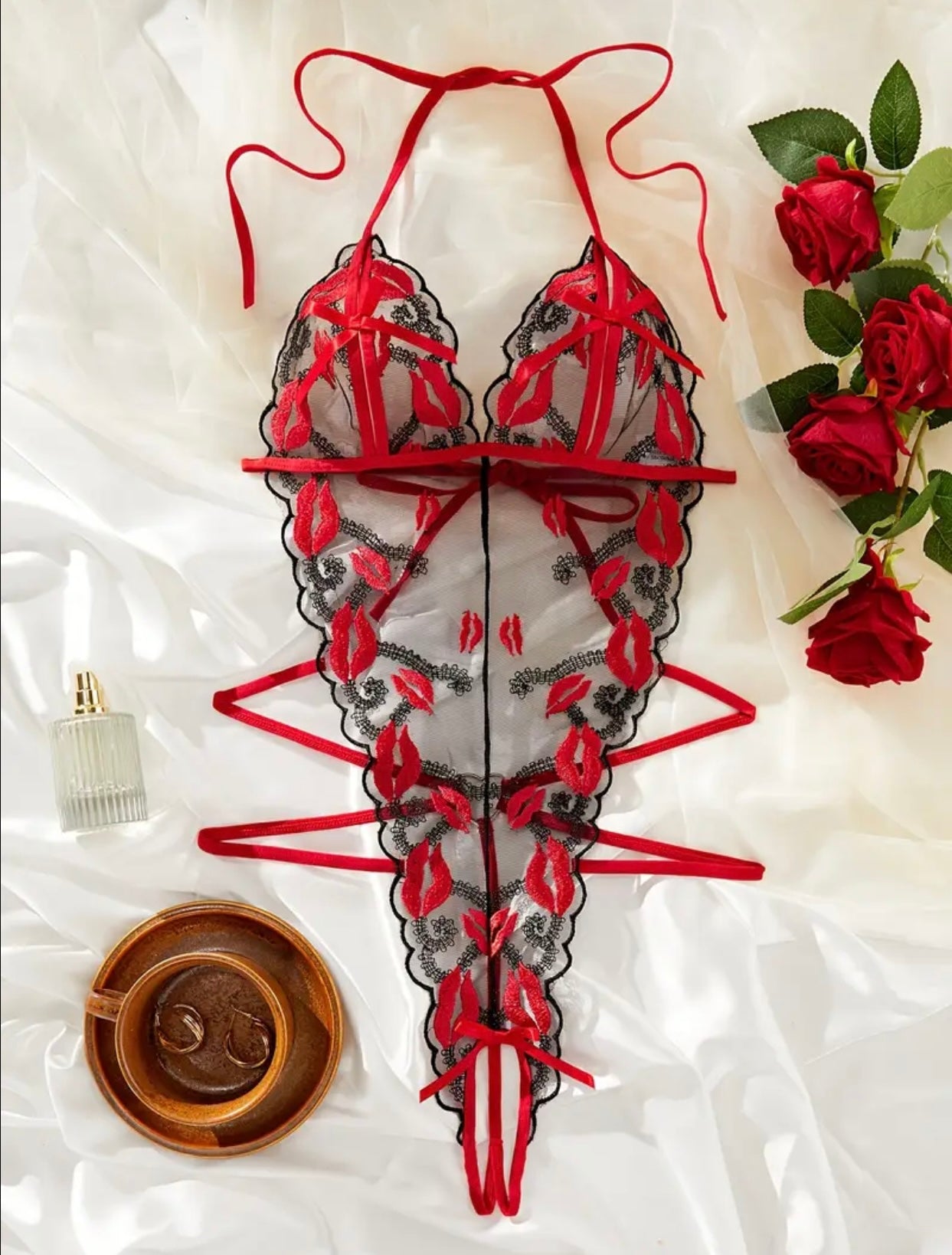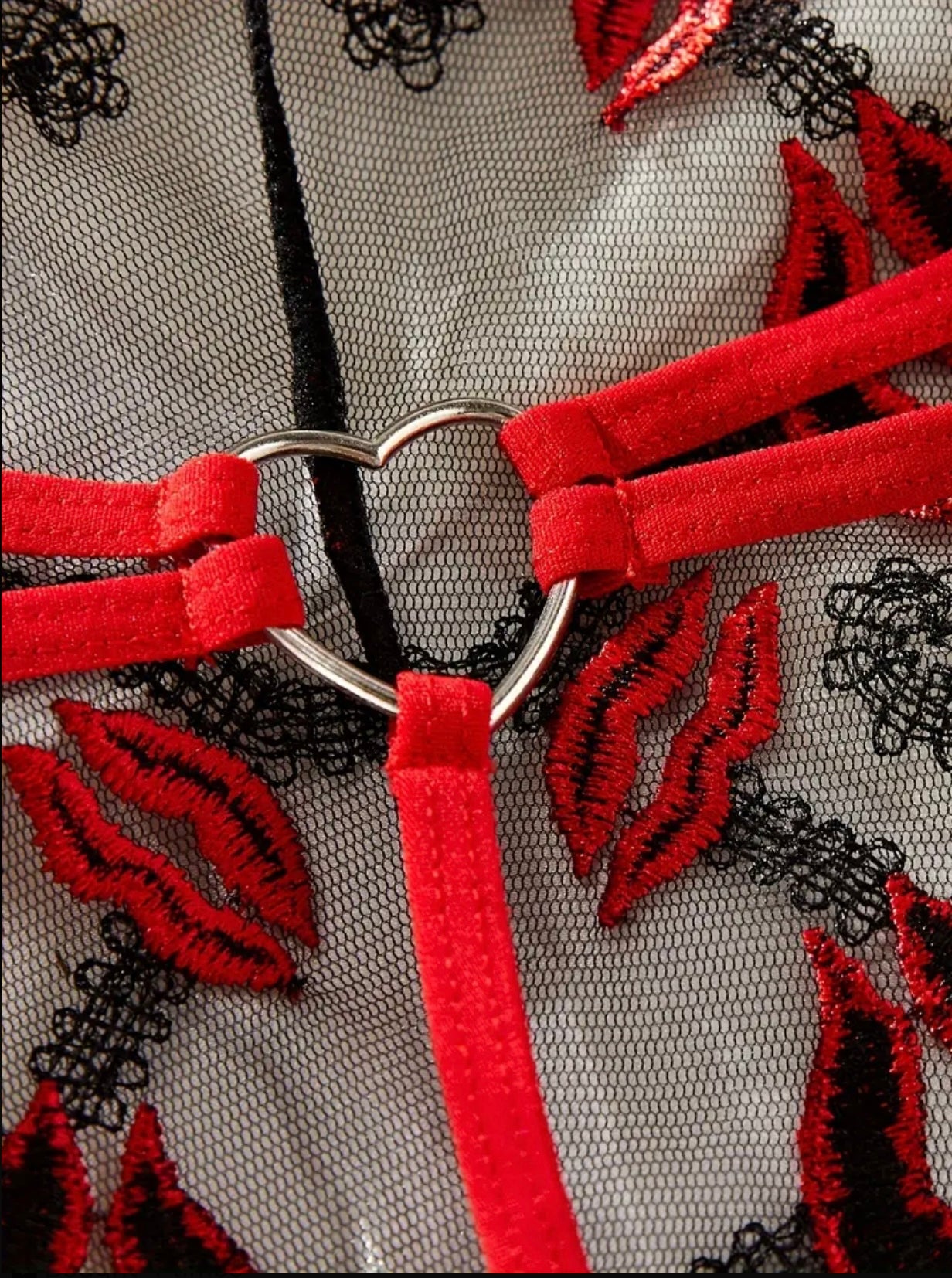 Mesh teddy bodysuit embroidered with a kiss, trimmed in red. Crotchless and with peekaboo nipples
