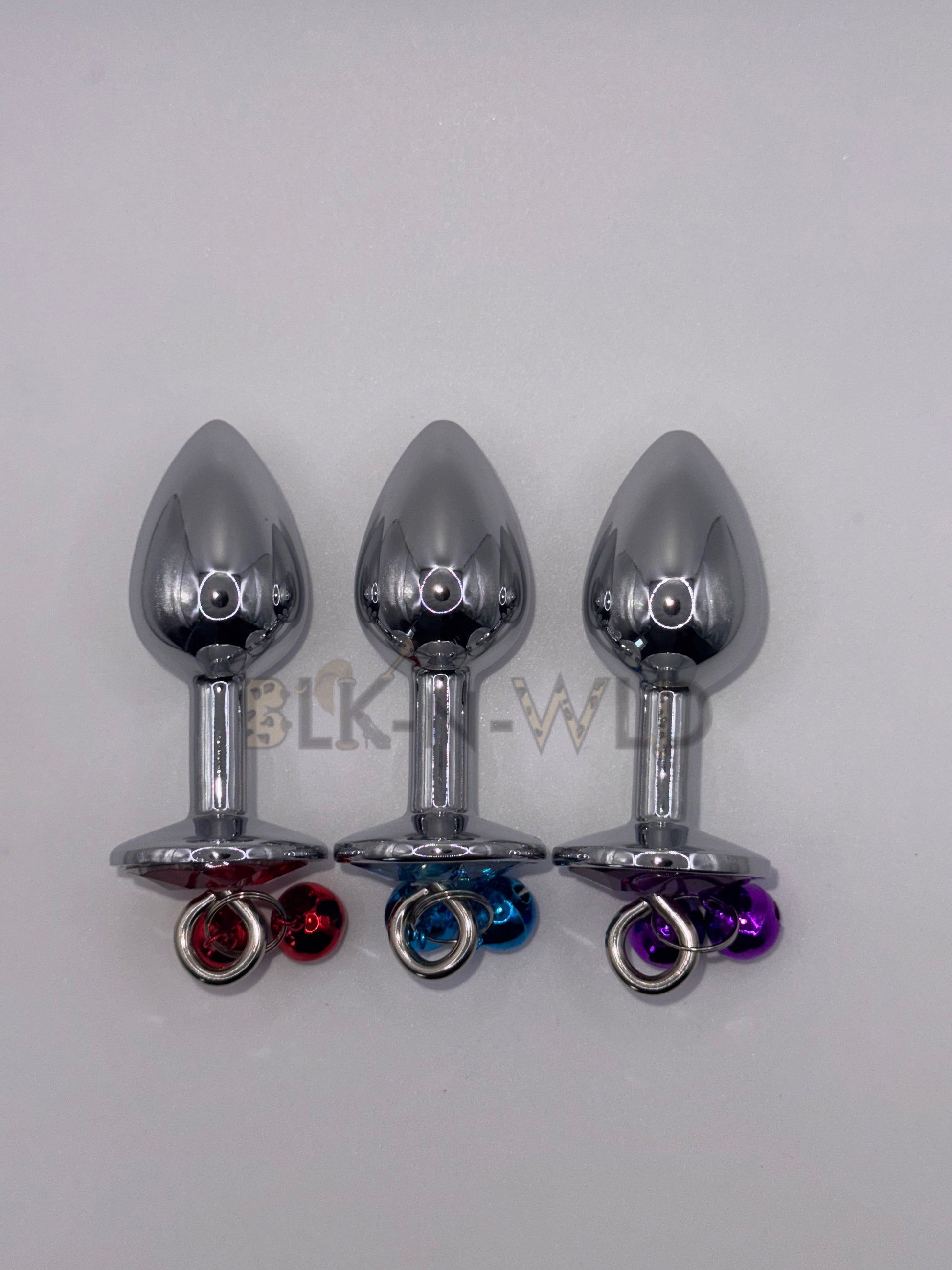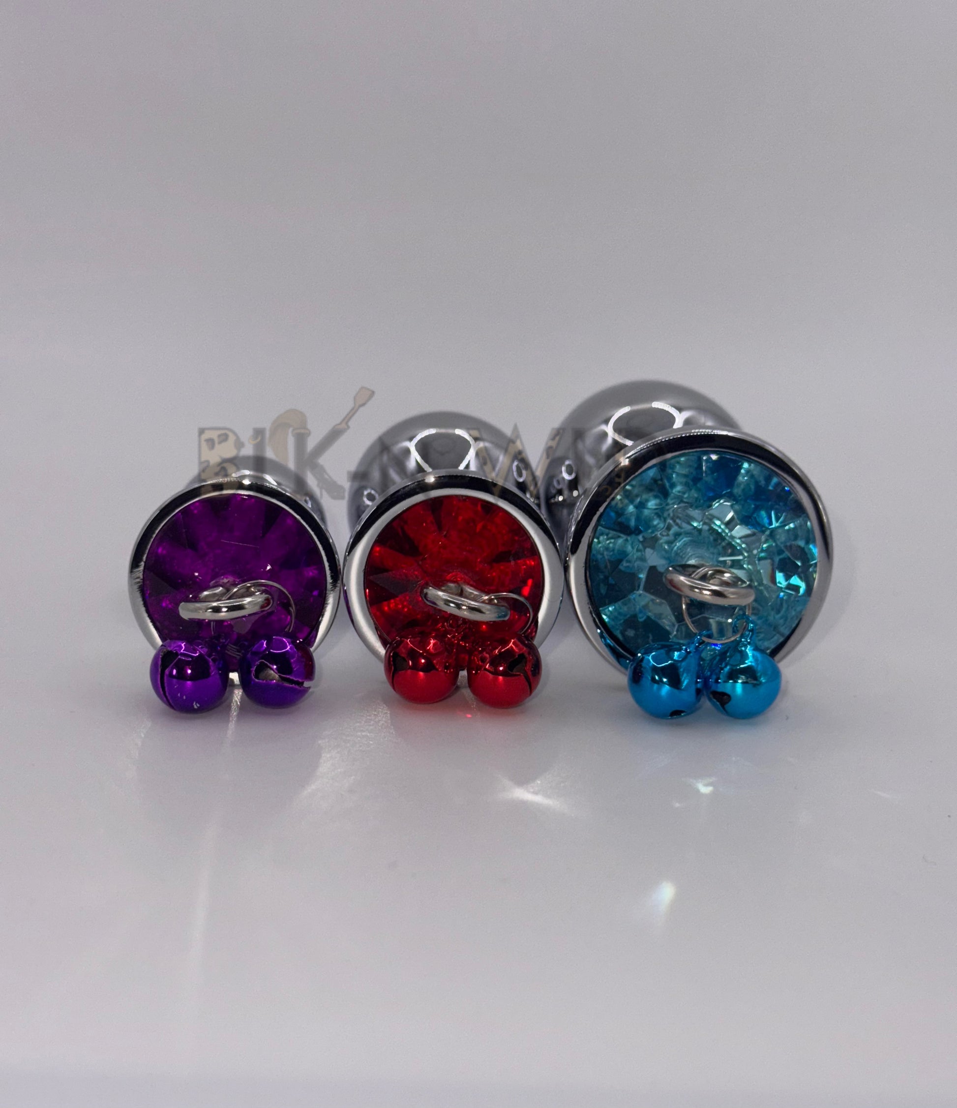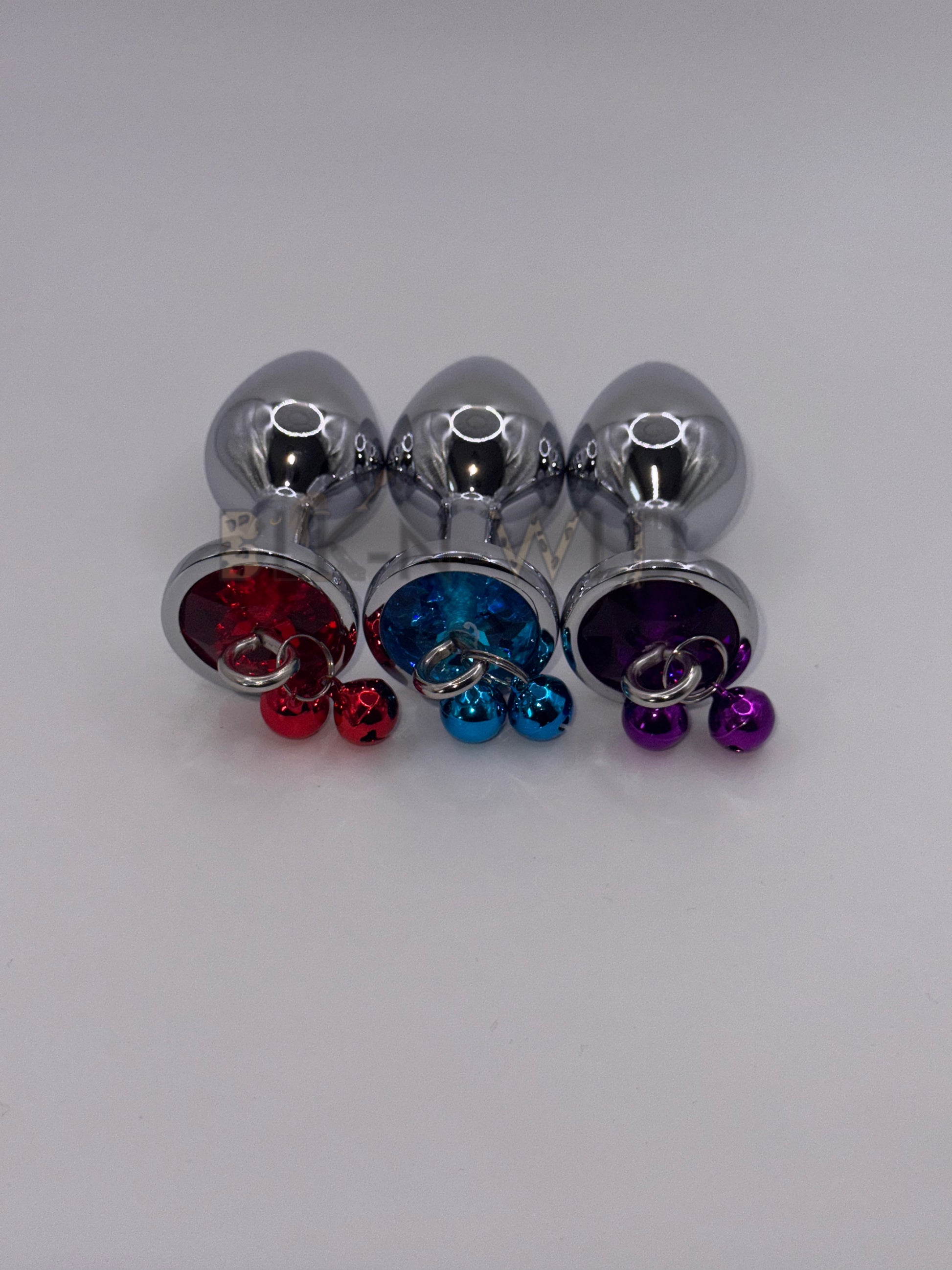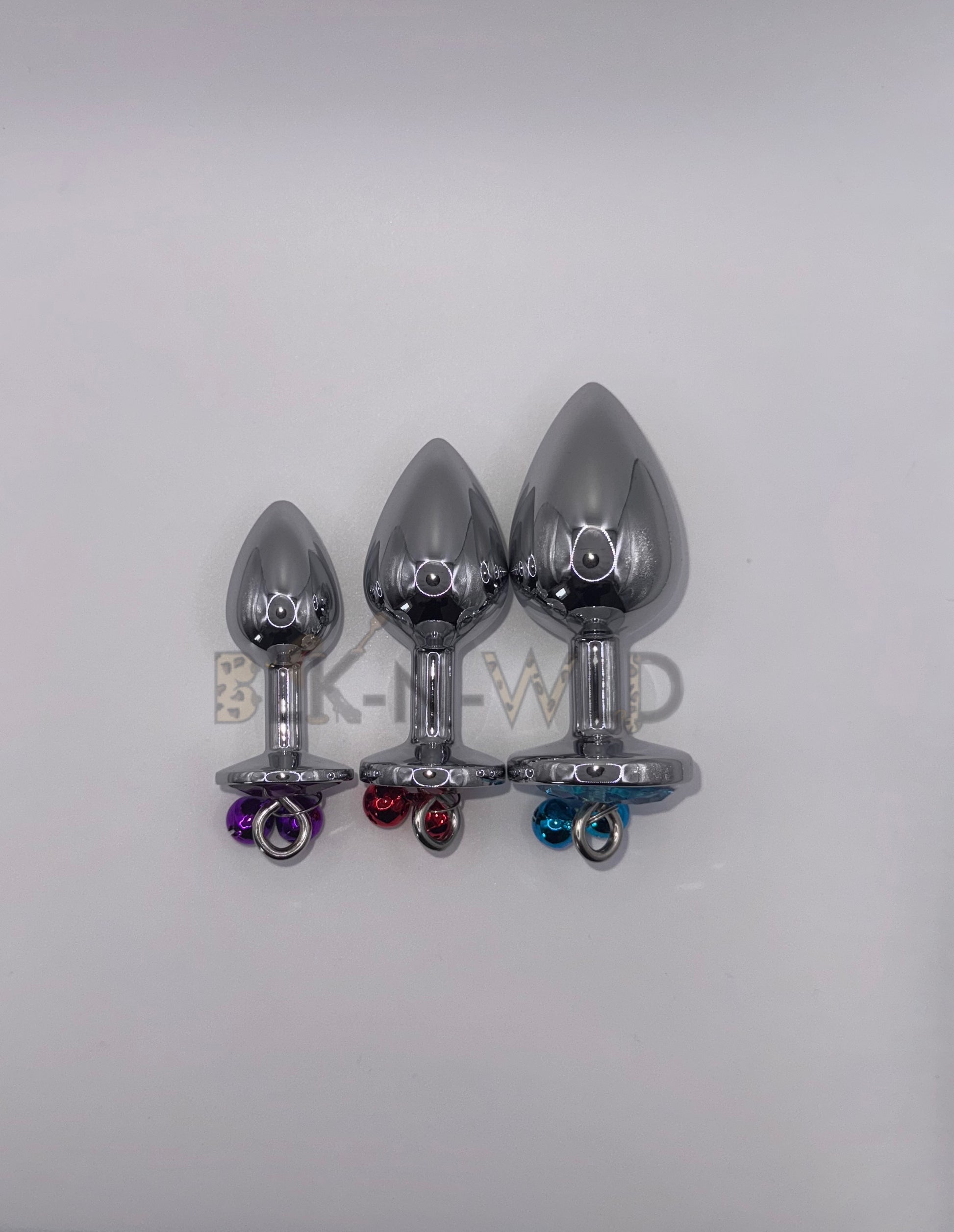 Smooth metal plugs with bejeweled ends, bells, and chained leashes. Available in 3 colors and 3 sizes; S/M/L and Red, Blue, and Purple