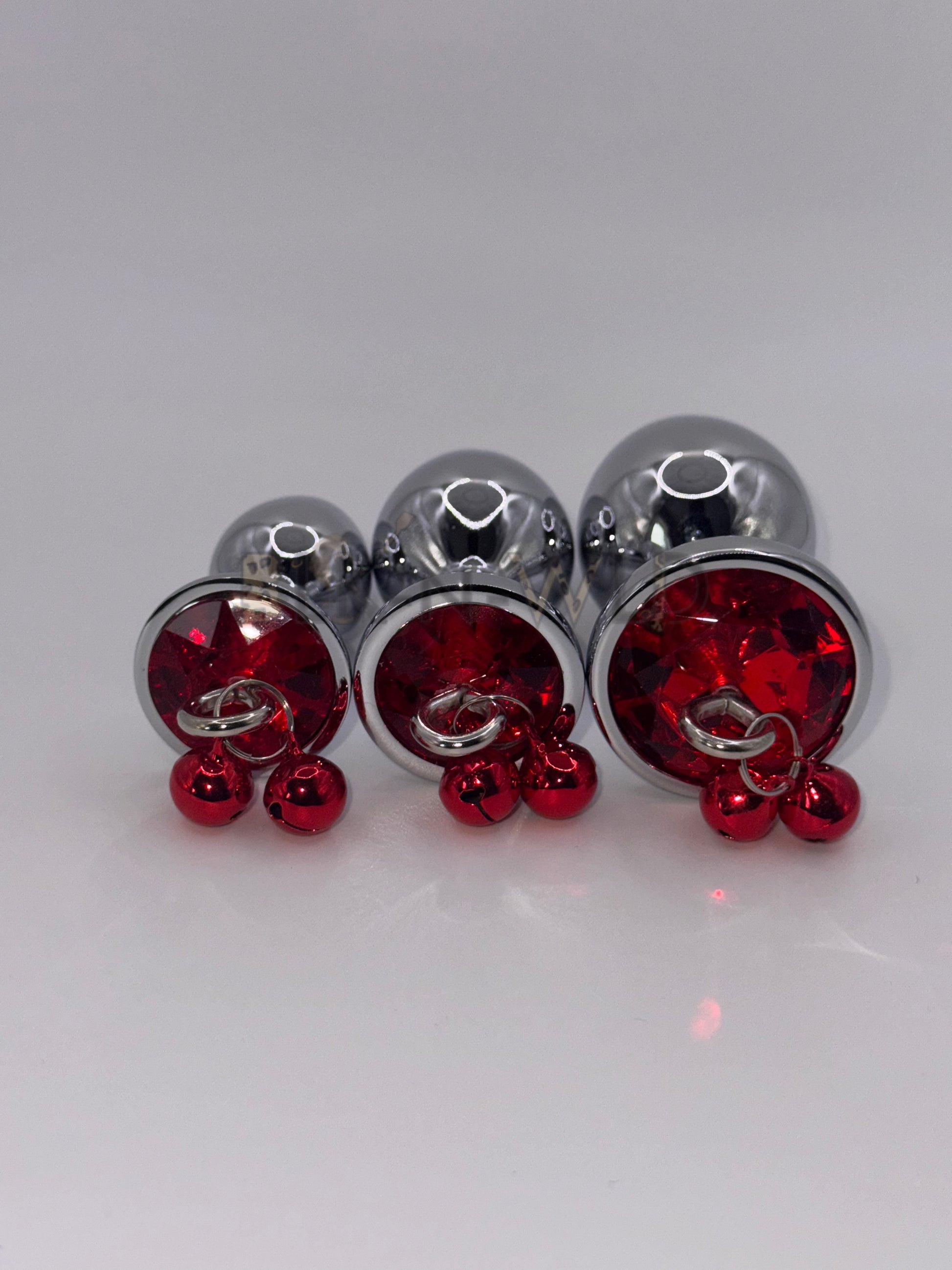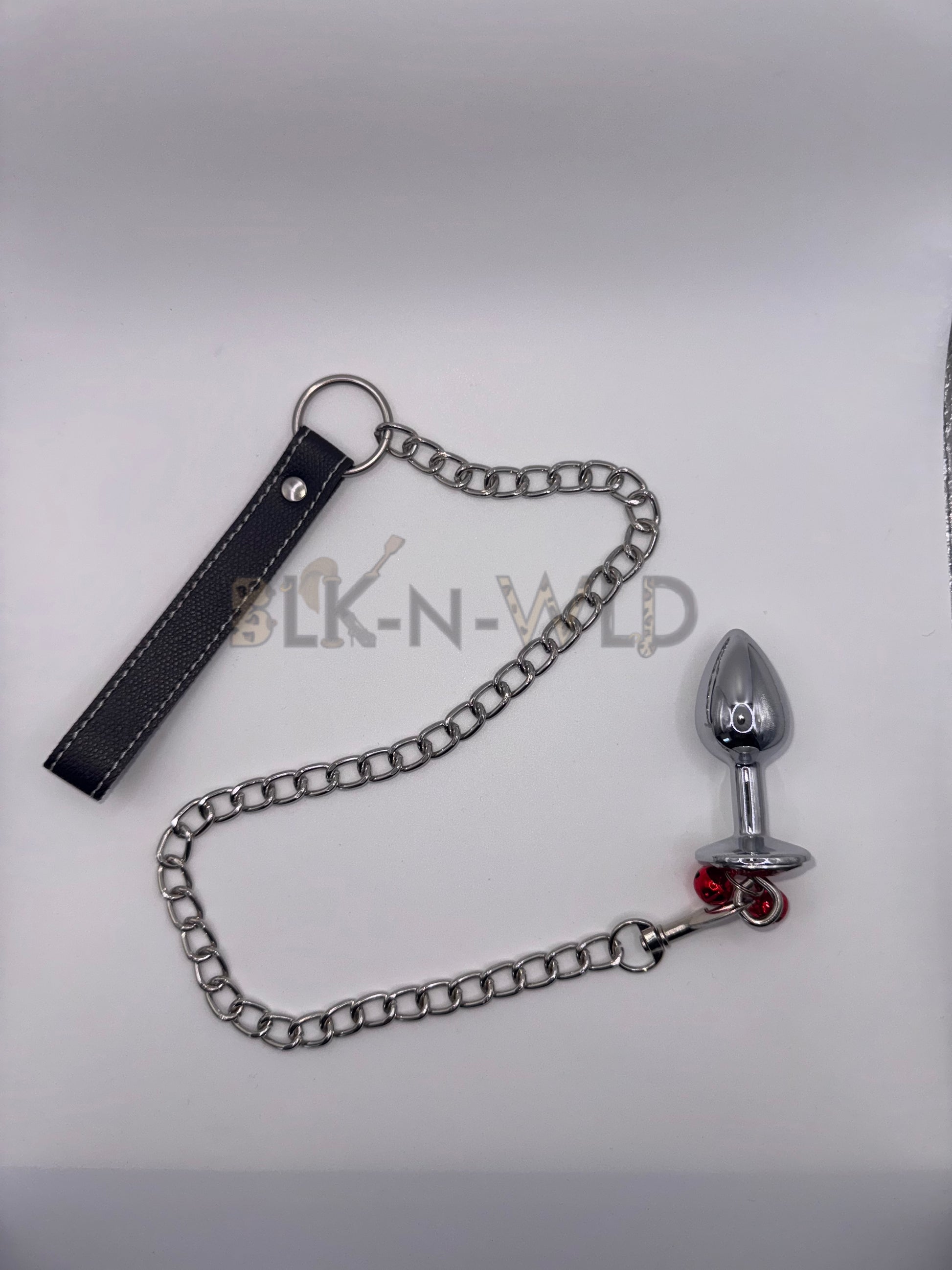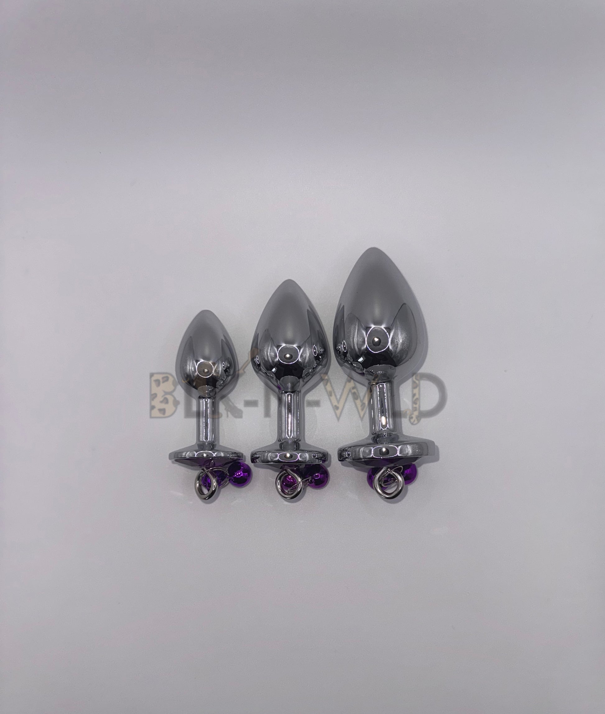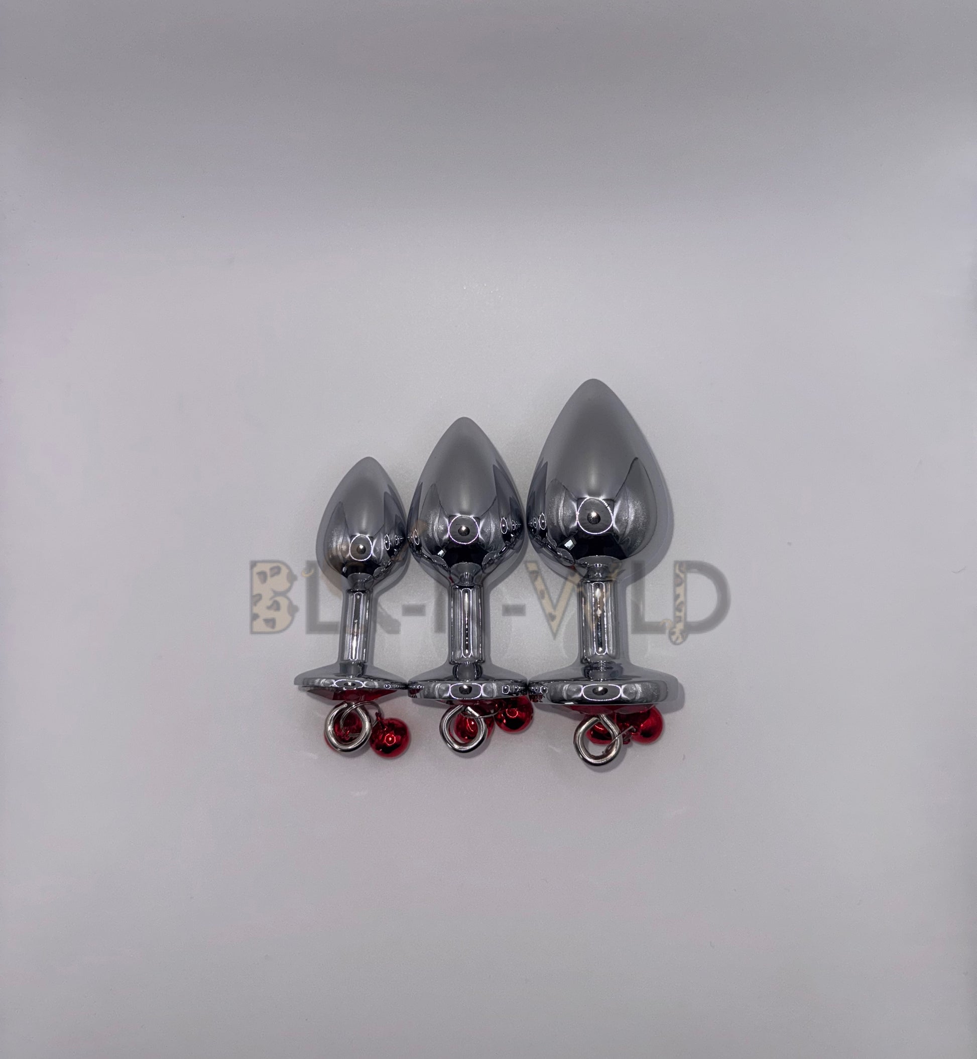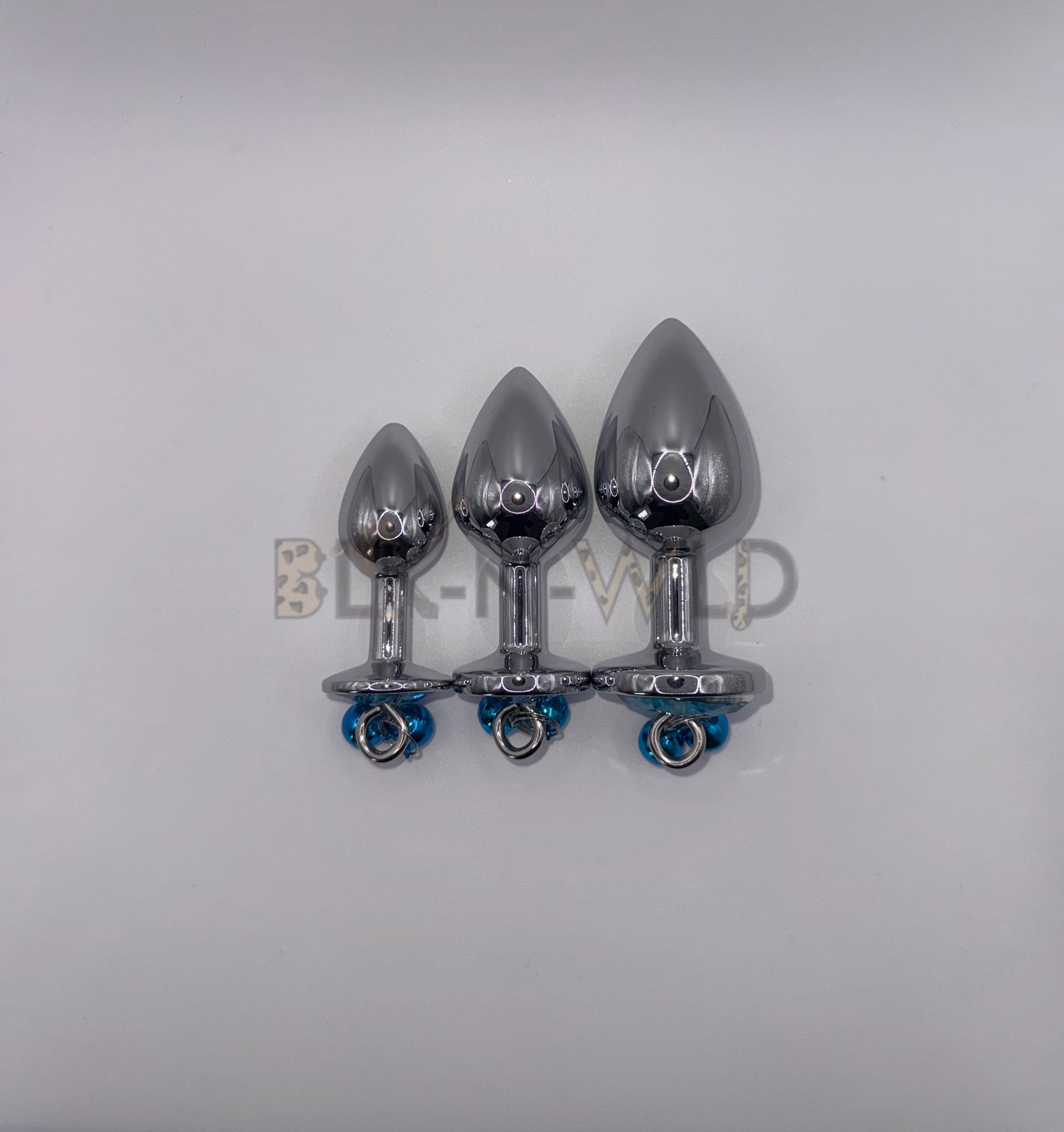 Smooth metal plugs with bejeweled ends, bells, and chained leashes. Available in 3 colors and 3 sizes; S/M/L and Red, Blue, and Purple