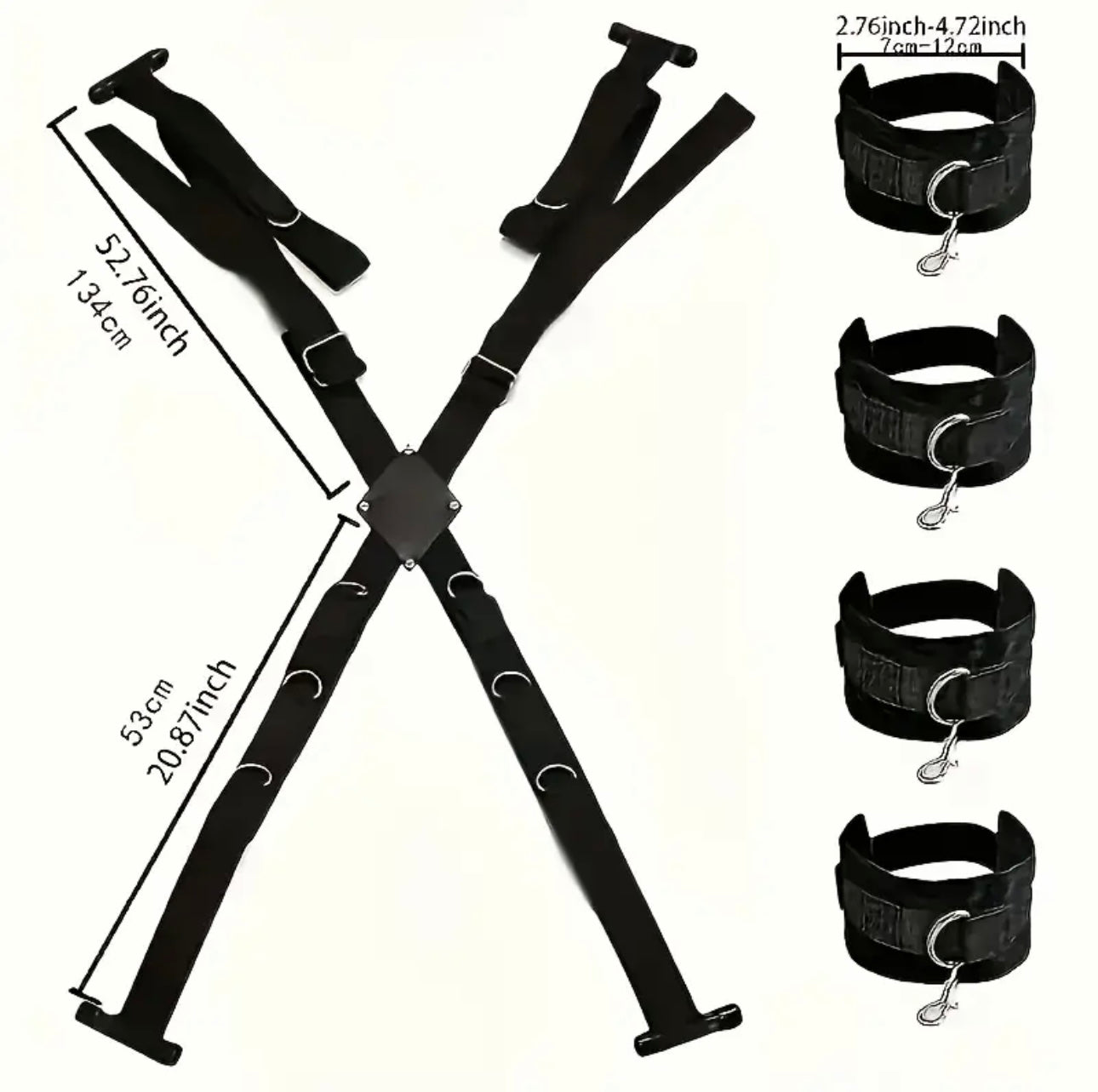 Short side is 21", long side is adjustable to 52.75" with 4 4.7" cuffs for wrists and ankles