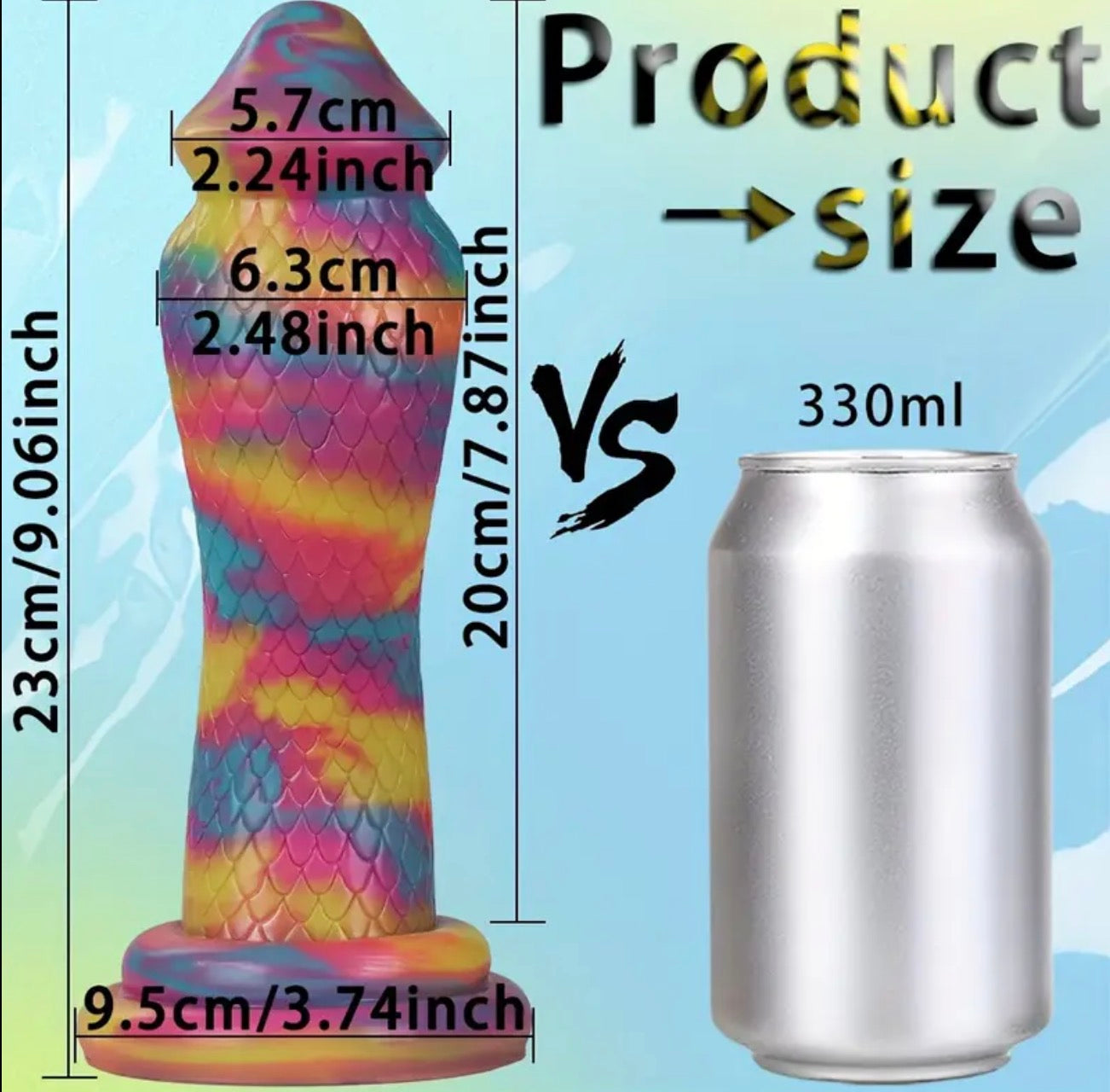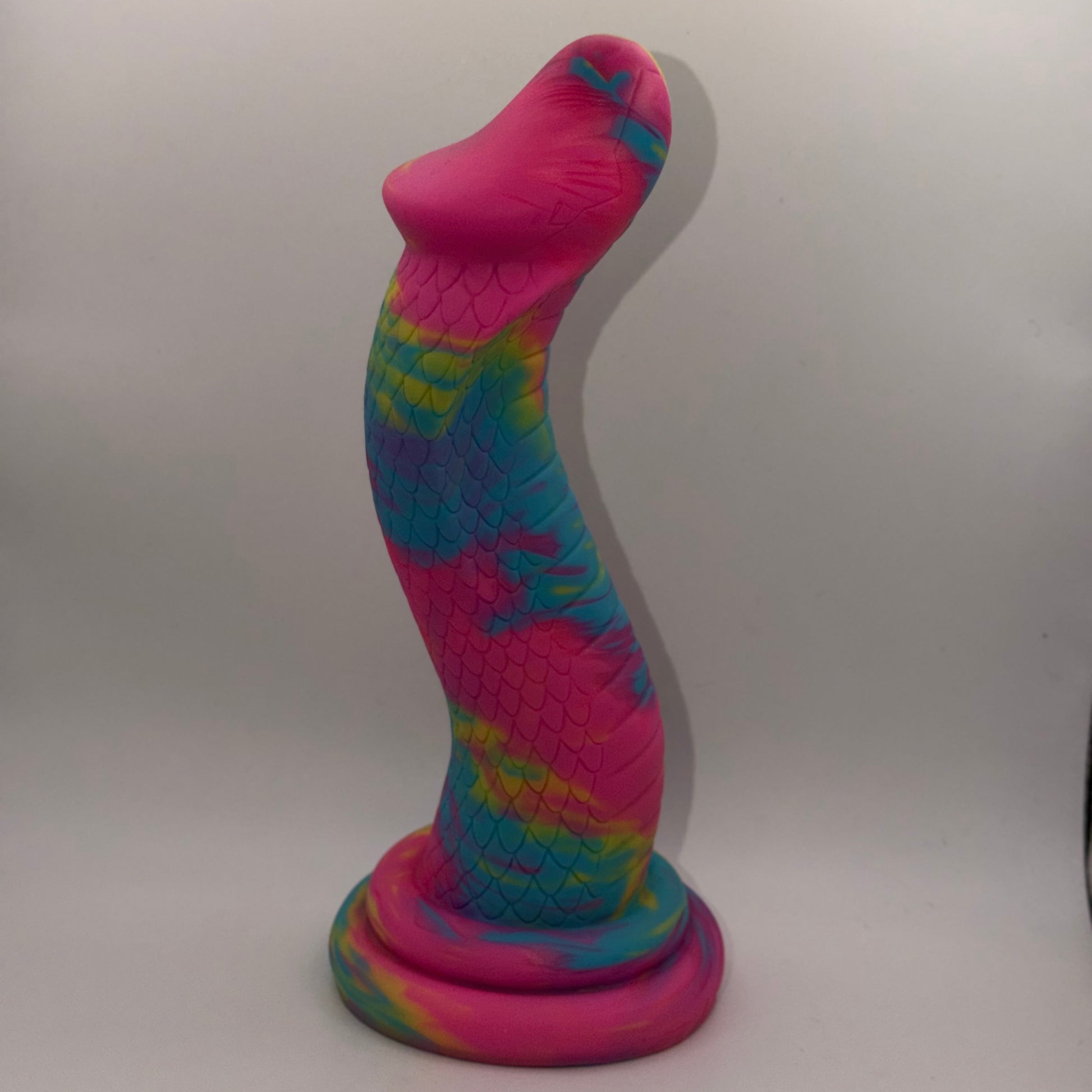 Massive silicone cobra shaped rainbow tie dyed dildo that8 usable inches, is 2.5” wide, and 18oz. With Incredible suction strength.