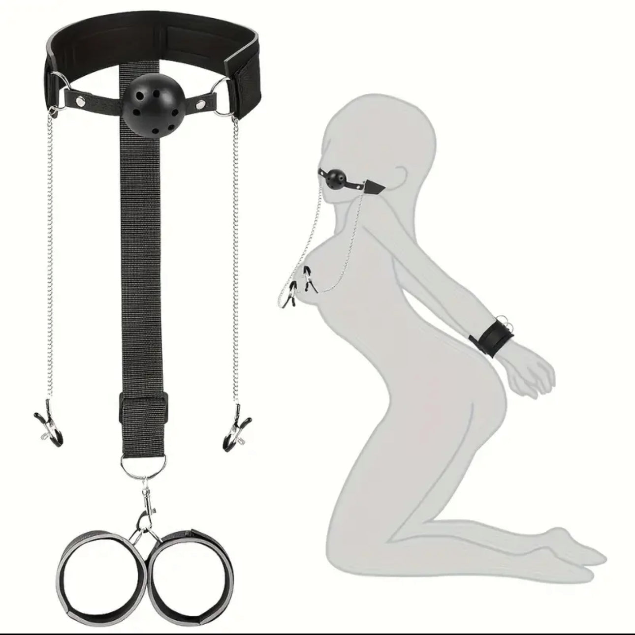 Ball gag with behind-the-back wrist restraints and nipple clamps