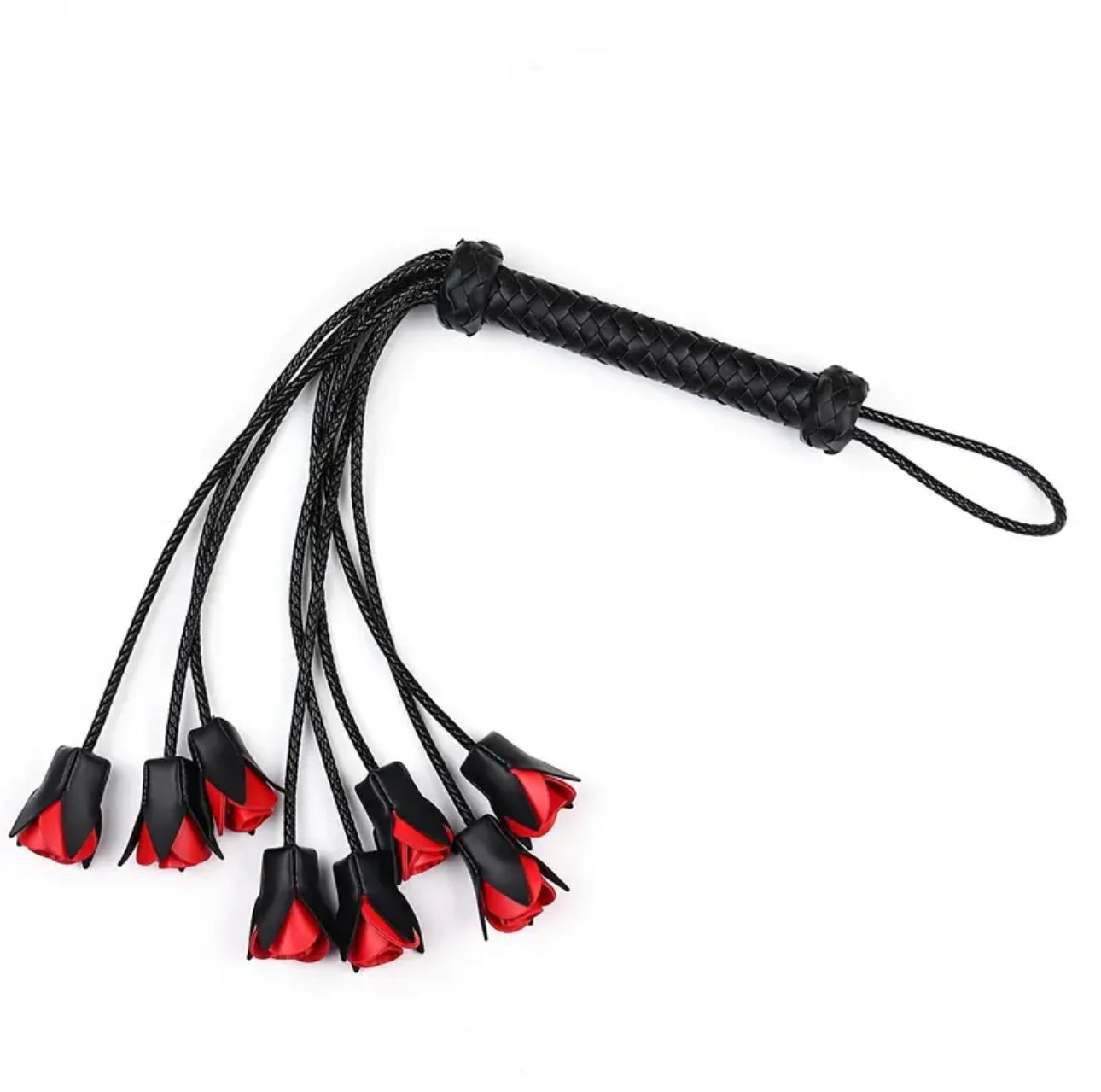 8 vegan leather red rose bubs on the ends of this whip