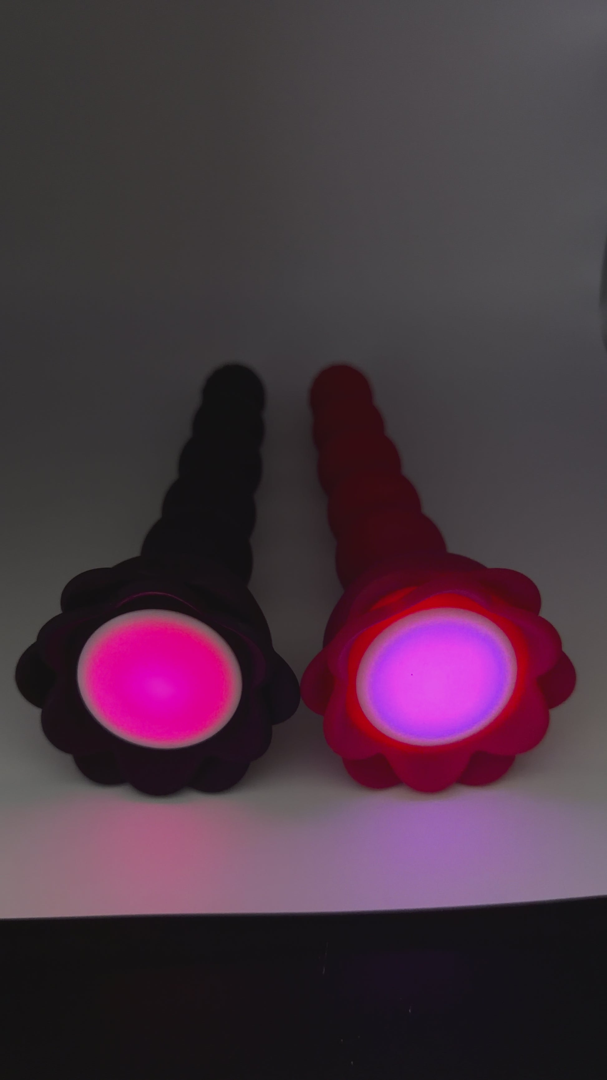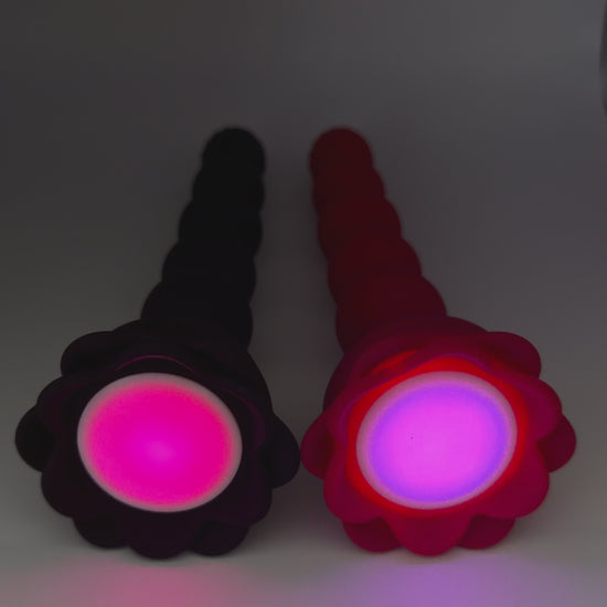 8.5” silicone vibrating anal beads w/remote control. 5 one-inch beads connected to a light-up base.